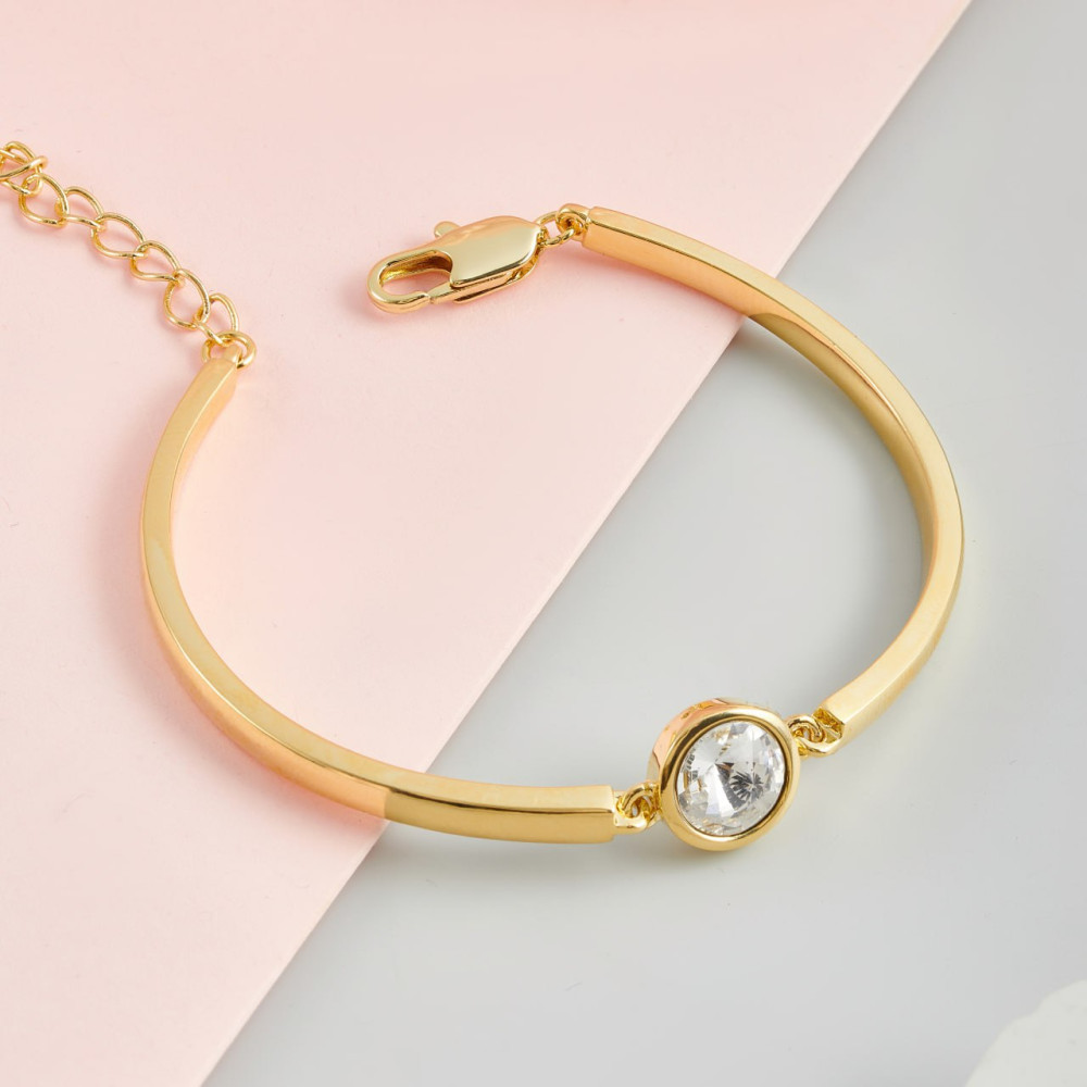 Стильный браслет с жесткой основой и регулируемой цепочкой — легко подстроить под любой размер запястья. Гальваническое гипоаллергенное покрытие безопасно для чувствительной кожи. Вставка из циркона дарит нежное сияние. Комфорт и эстетика в одном аксессуаре.