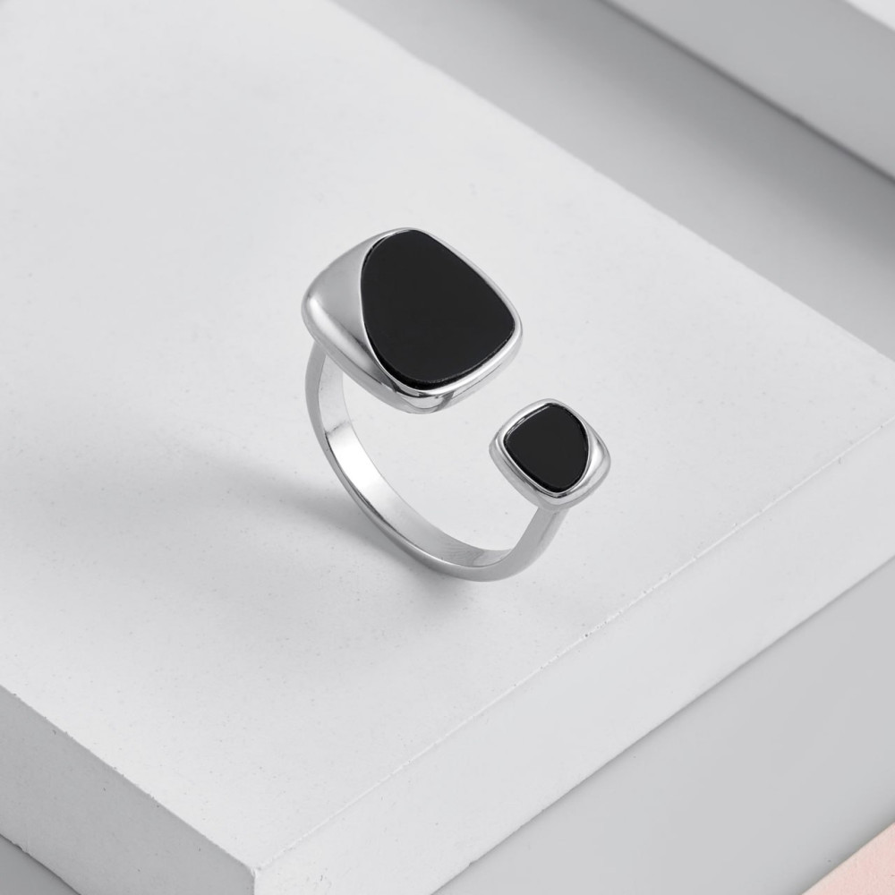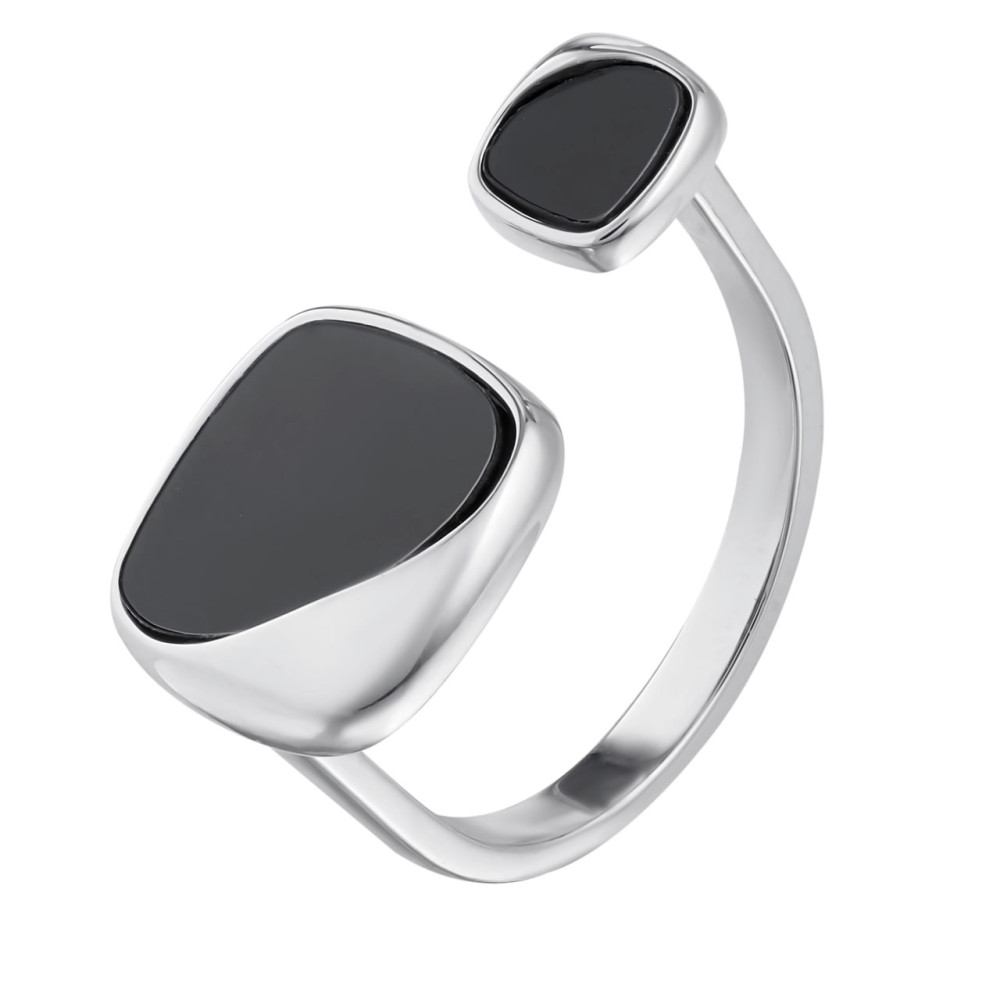 Стильное безразмерное кольцо с черной эмалью и родиевым покрытием. Разомкнутая основа позволяет легко регулировать размер под любой палец в обе стороны. Гальваническое покрытие родием обеспечивает благородный блеск и защиту от потемнения, а черная эмаль придает модели глубину и изысканность.
