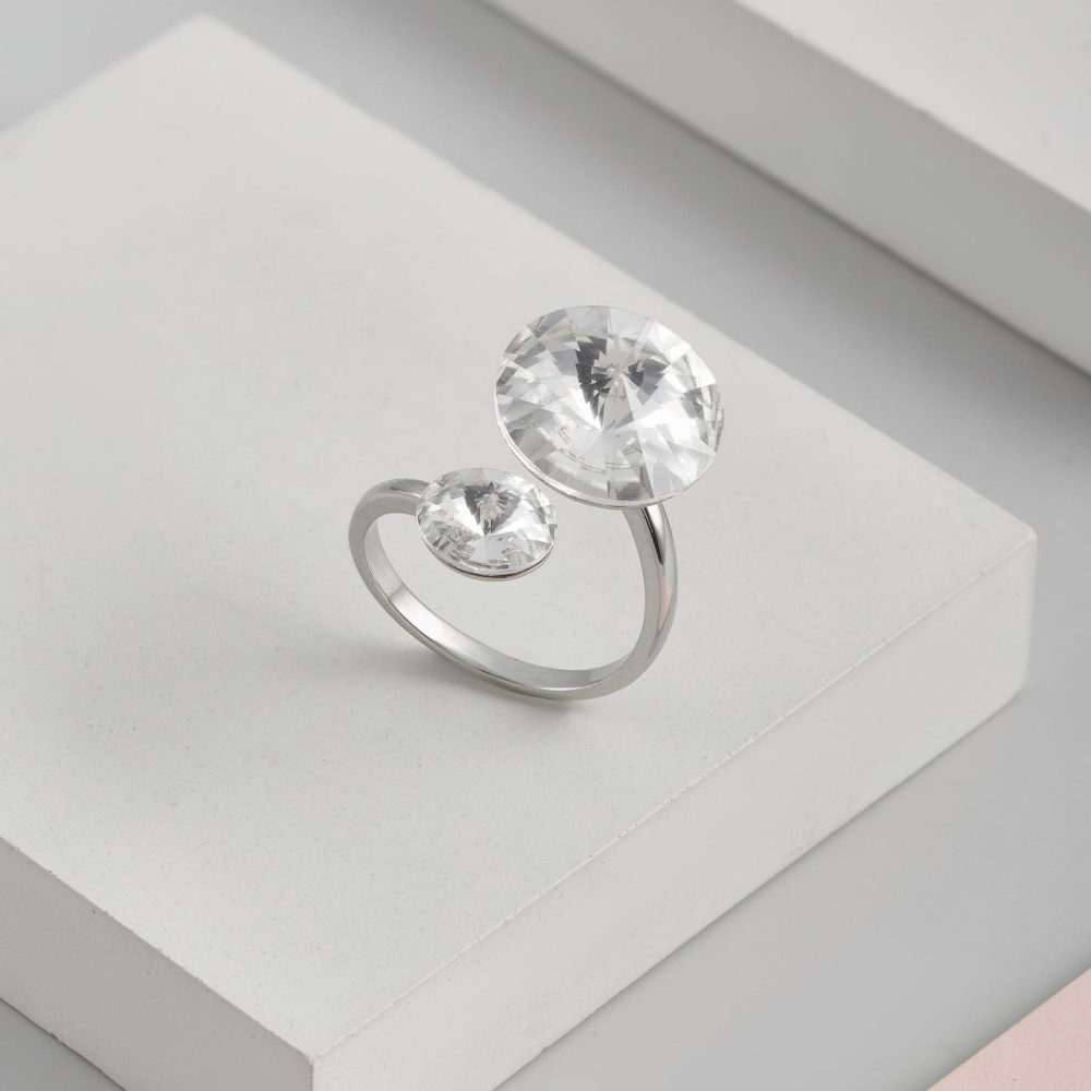 Стильное безразмерное кольцо с белым камнем циркон. Разомкнутая основа позволяет легко регулировать размер под любой палец. Гальваническое покрытие родием обеспечивает благородный блеск и полную защиту от воды.