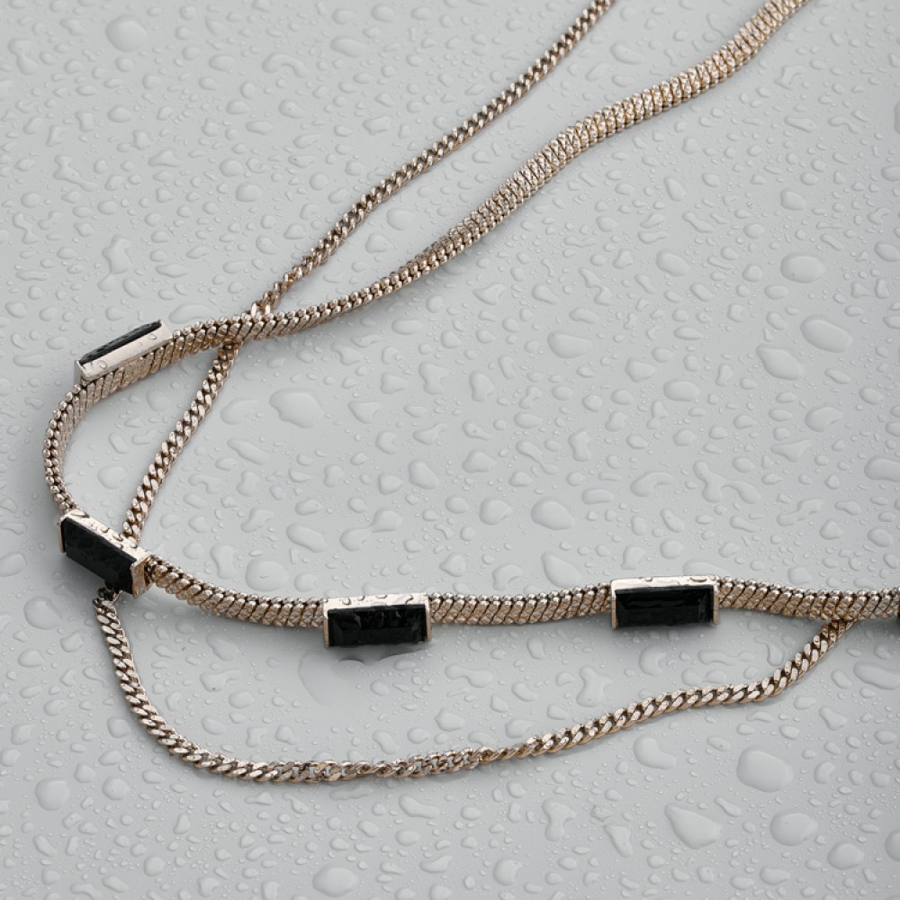 Двойное колье выполнено из гипоаллергенного сплава, что делает её идеально безопасной для кожи. Замок карабин обеспечивает надежность и комфорт при ношении.