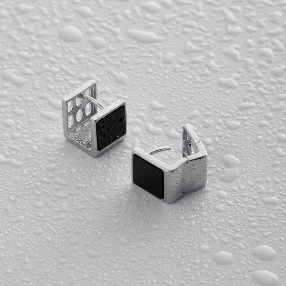 Геометрические серьги-квадраты с вставкой из черного акрила. Покрытие из родия дарит украшению стойкий блеск и защиту от окисления. Гипоаллергенный сплав обеспечивает комфорт даже для самой чувствительной кожи.