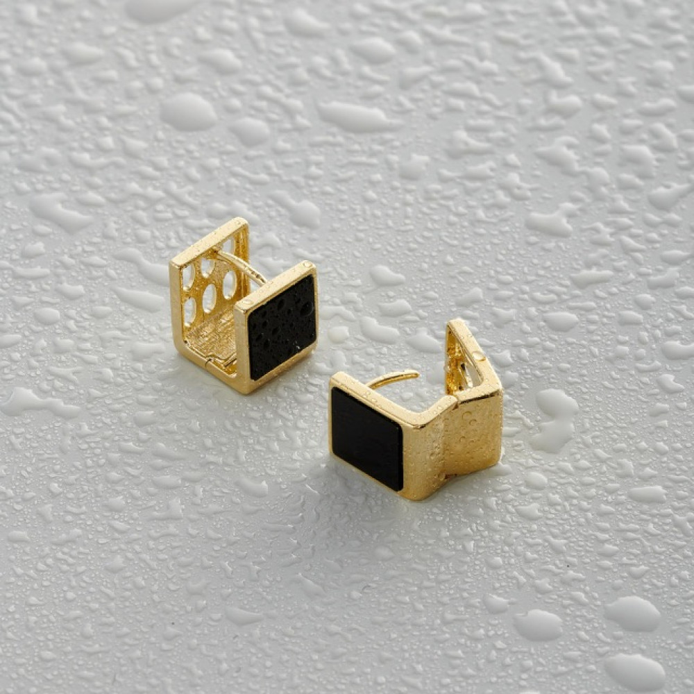 Эти серьги созданы для поклонниц минимализма и четких линий. Квадратная форма с вставкой из черного акрила выглядит современно и графично, а золотистое покрытие добавляет образу теплоты.